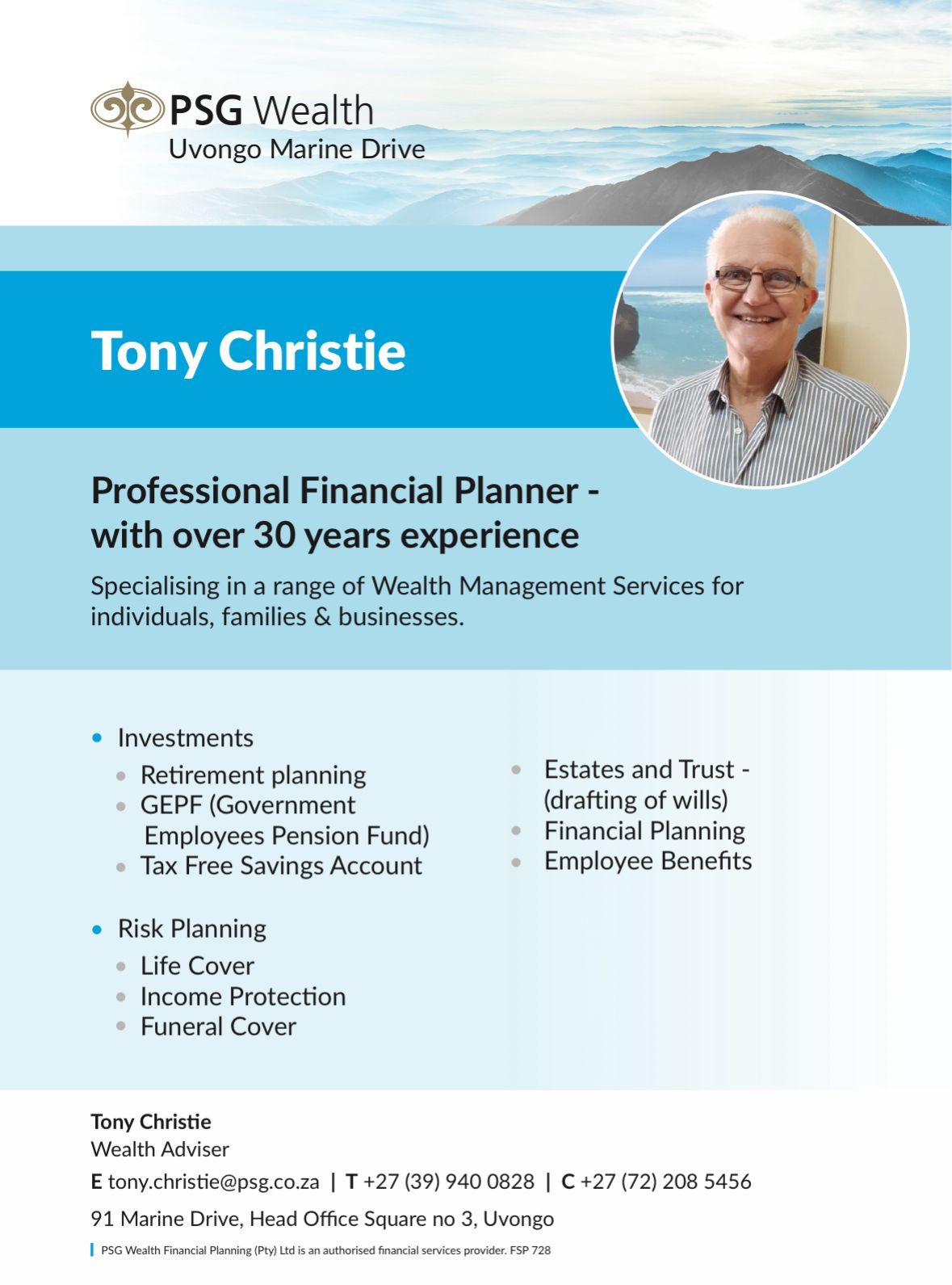 Speak to local Professional Financial Planner Tony Christie at PSG Wealth Uvongo Marine Drive and discuss your options properly - retirement planning, investments, risk cover, and structured financial advice that actually makes sense. đ