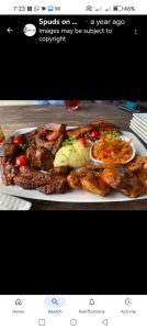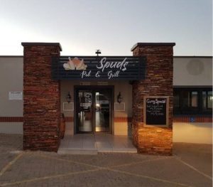 Spuds serves classic pub fare such as nachos, Frito pies, and smoked meat dinner plates with choices like brisket, chicken, pulled pork, and ribs.
