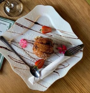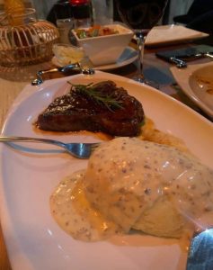The restaurant has a wood-fired pizza oven and a variety of pizza to choose from.