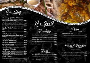 Flame favourites – beef or chicken prego rolls, juicy burgers and smokey ribs, steaks and kiddies meals.