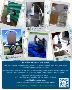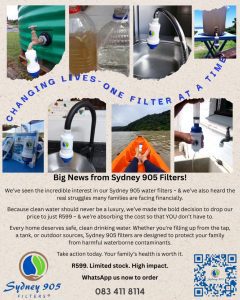 The Sydney 905 Filters ® are the most versatile filters in the global market thus allowing numerous setup configurations. They also prove to be one of the more sustainable, fastest, easiest, highly effective and most cost efficient ways to get safe water REGARDLESS of water source.